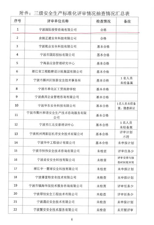 7月15日,市安全生產(chǎn)協(xié)會發(fā)文通報了我市三級安全生產(chǎn)標(biāo)準(zhǔn)化評審單位抽查結(jié)果。本次抽查內(nèi)容包括評審組織符合性、評審程序規(guī)范性、評審組提出問題專業(yè)性、評審記錄完整性、被評審企業(yè)對評審單位認可度等。共被抽查的14家評審單位,其中2家合格,12家基本合格,我公司為合格單位。