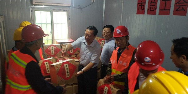 慰問中,太原市總工會黨組書記、常務副主席馮潤春來到施工現場及宿舍區與農民工一一握手,并把月餅親手送到了農民工手中,他希望農民工不忘初心,砥礪前行,為太原城市建設添磚加瓦,再立新功!