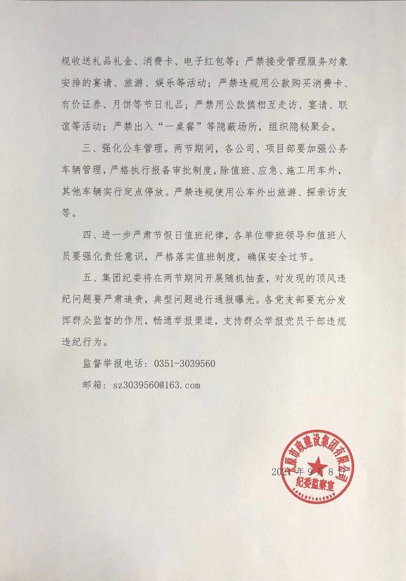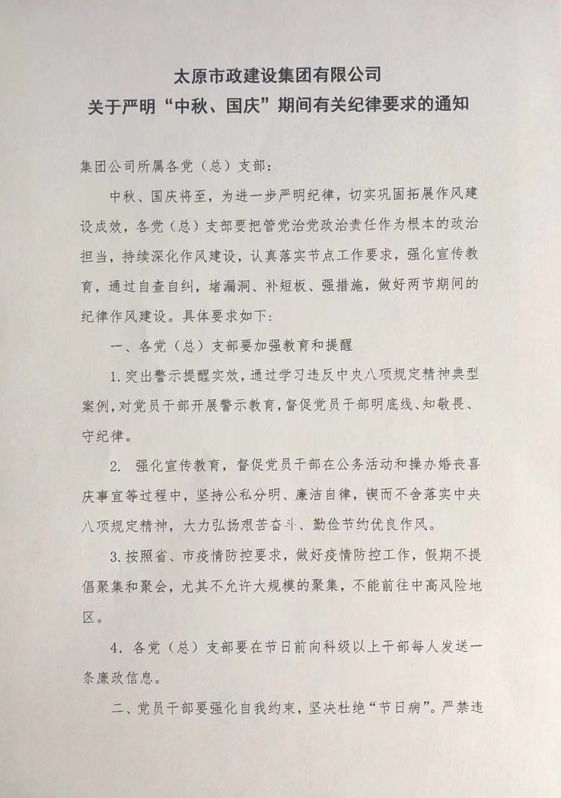 太原市政建設集團有限公司關于嚴明“中秋、國慶”期間有關紀律要求的通知