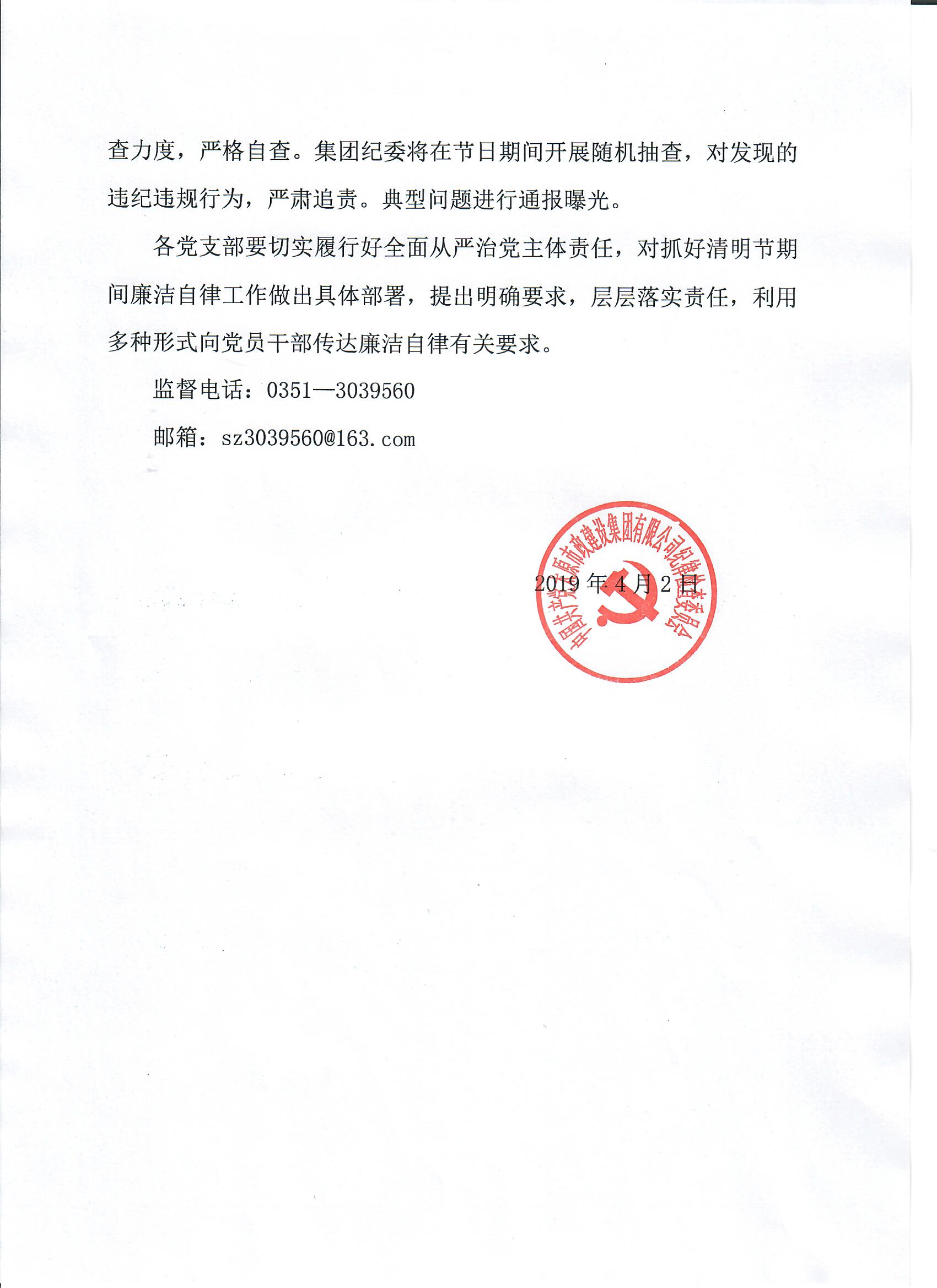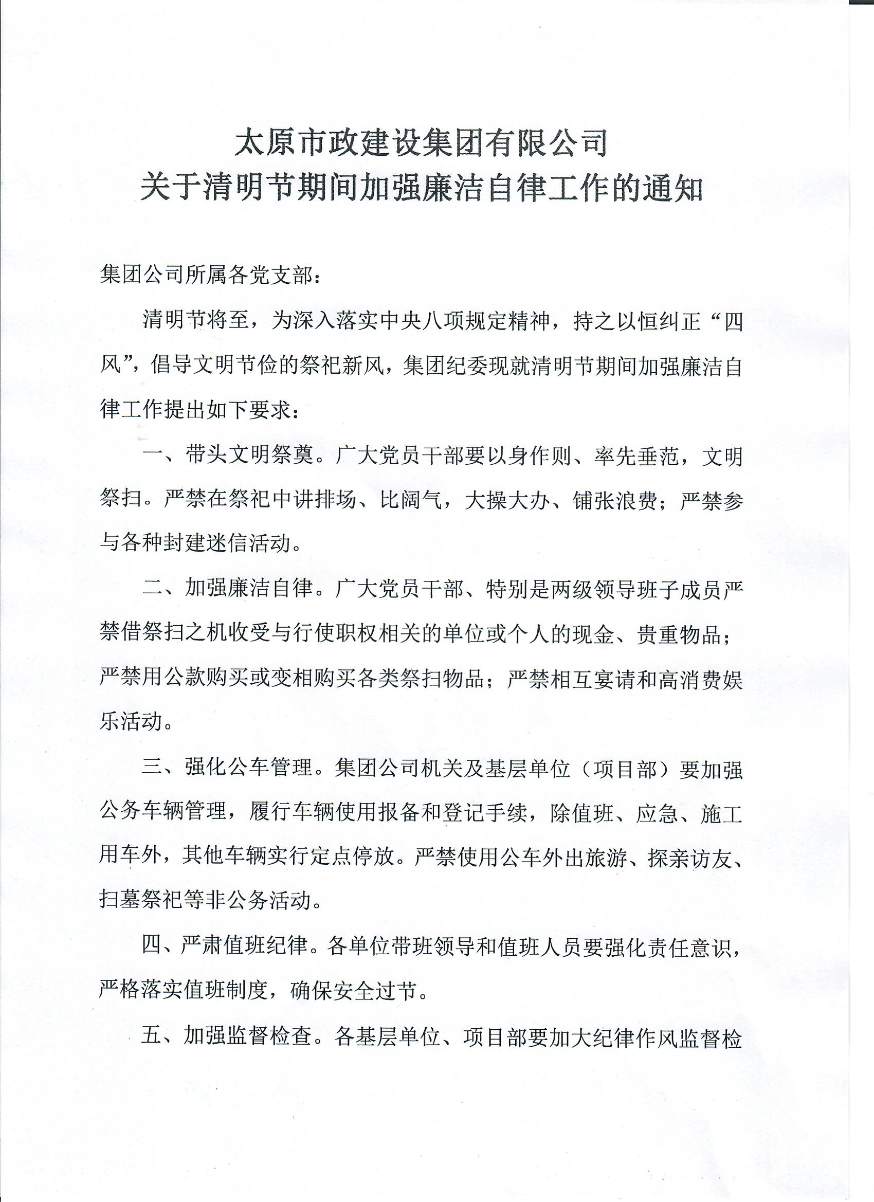 太原市政建設集團有限公司關于清明節期間廉潔自律工作的通知