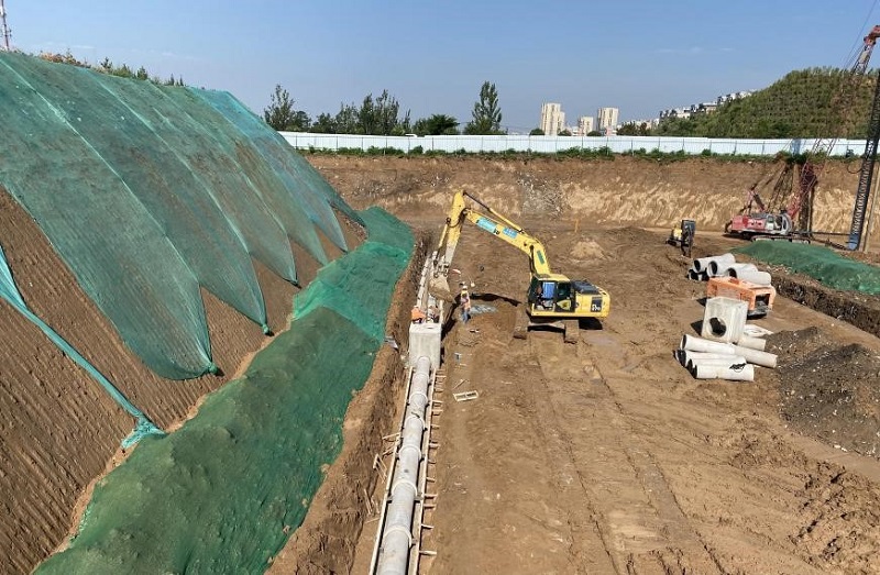 該工程雨污水管道、電力隧道的部分管線為深溝槽作業(yè),溝槽平均深度為4米,最深處達6米。同時,該工程部分路段涉及挖方量大的情況,這些都增加了施工難度和危險系數。項目部技術人員根據施工現(xiàn)場實際情況,共同研究應對措施,制定了《深溝槽開挖專項方案》和《大挖方邊坡修整、支護方案》,采取了分級放坡開挖和邊支護邊開挖的方式,有效防止兩側土體的塌落;在挖方路塹施工時,及時掛網噴漿,有效維護了邊坡穩(wěn)定;在開挖坡頂設置了截水溝,有效防止雨水的溝槽和邊坡的沖刷和浸泡,增加了施工的安全系數,切實保證了在溝槽和路塹開挖段內作業(yè)機械和人員的安全。