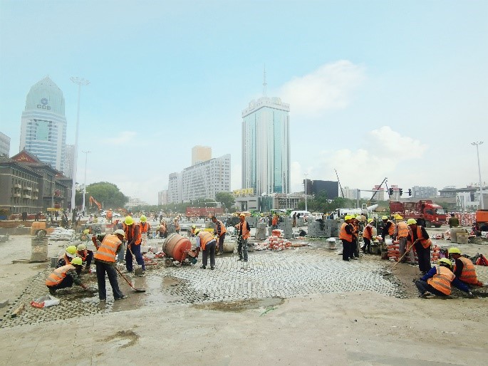 廣場南路段是目前施工最為忙碌的一個路段,花崗巖丁石砌筑、路面清理、廣場綠化、路側石安裝多道工序同時進行。道路一側工人們正在進行花崗巖丁石切割、鋪裝、灌縫、打磨,另一側路側石的安裝、砌筑也在同步作業;園林綠化還在進行廣場的裝飾;叉車來回穿梭著運送石料、水泥,霧炮車在工地上不停降塵,灑水車正在對路面進行清洗,打磨機正在對花崗巖丁石進行打磨,全體施工人員上下一心,24小時奮戰在施工一線,以“鐵軍”的堅定意志,確保工程按期完工。