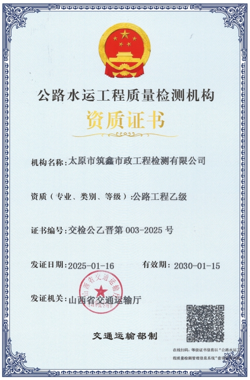近日,筑鑫公司成功獲得公路水運工程質(zhì)量檢測機構(gòu)“公路工程乙級”資質(zhì)證書。此次資質(zhì)升級,不僅是對筑鑫公司在公路工程檢測領(lǐng)域?qū)I(yè)實力的有力證明,更是其實現(xiàn)跨領(lǐng)域發(fā)展的重要里程碑,意味著下一步能夠為公路工程建設(shè)提供更多維度、更具專業(yè)性與精準度的檢測服務。