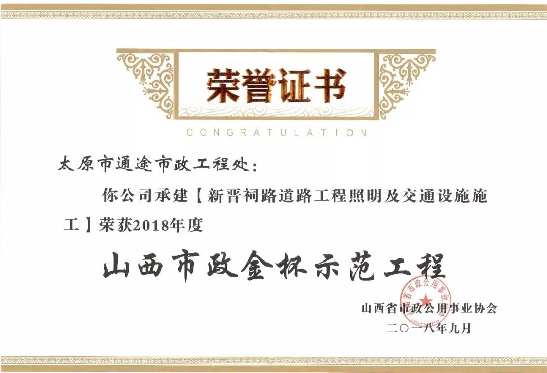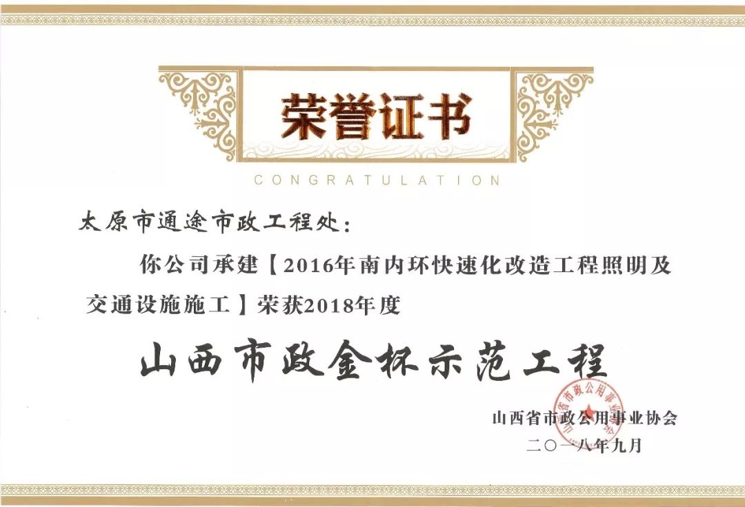 9月20日,通途市政工程處承建的南內環快速化改造工程照明及交通設施施工、新晉祠路道路工程照明及交通設施施工榮獲山西省市政公用事業協會頒發的2018年度“山西市政金杯示范工程”榮譽稱號。