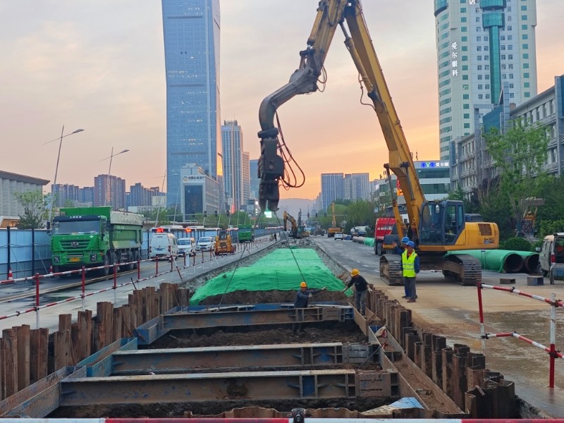 “追求精細極致,鑄就基坑支護的穩固防線”。項目部將鋼板樁施打質量視為確保基坑安全與質量的關鍵環節,嚴格執行材料準入制度,所有進場鋼板樁均經過材質證明核查、尺寸精度測量和外觀質量檢驗三重把關,確保樁身無裂紋、無銹蝕等質量缺陷,從源頭上杜絕不合格材料。施工中,施工人員采用全站儀進行動態監測,嚴格控制樁身垂直度偏差在規定范圍內,詳細記錄每根樁的打入深度、貫入度等關鍵參數。拔樁階段采用專用施工設備,按照“先支后拆、分段拔除”的原則有序進行,拔樁后出現的孔隙立即灌砂,最大限度減少對周邊土體的擾動,實現平穩施工與環境保護的和諧統一。