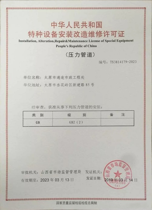 通途市政工程處喜獲山西省市場(chǎng)監(jiān)督管理局頒發(fā)的中華人民共和國(guó)特種設(shè)備安裝改造維修許可證
