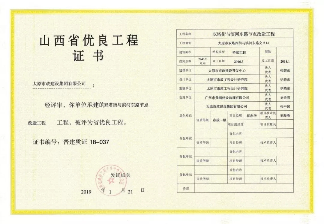 太原市政建設集團有限公司雙塔街與濱河東路節點改造工程榮獲“山西省優良工程”榮譽稱號
